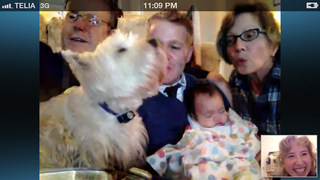 Skype really is amazing... so I'll be able to say hi to these people, including the littlest Minor! She was wide awake and super active before I thought to take screen shots. I can't wait for the real live baby-time!